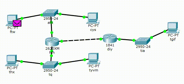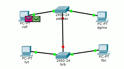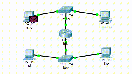 Создана сеть из четырёх компьютеров, двух коммутаторов и маршрутизатора